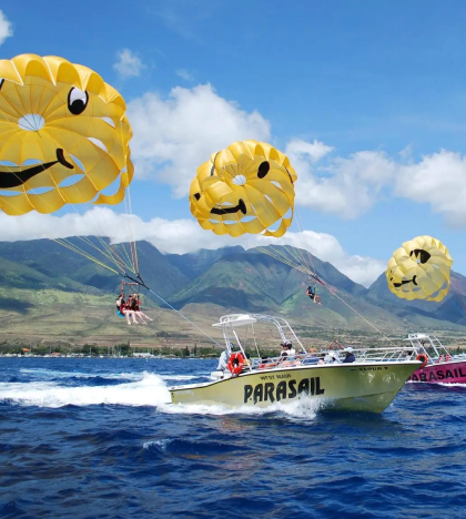 Experience the thrill of flight with Kā‘anapali Beach Parasail, Maui’s premier parasailing adventure. Soar up to 1,200 feet above the crystal-clear waters of West Maui and take in breathtaking views of Lahaina, Lāna‘i, and the West Maui Mountains. Conveniently located directly on world-famous Kā‘anapali Beach behind Whalers Village, we offer unforgettable rides with experienced crew, top-tier safety standards, and the perfect mix of excitement and aloha.